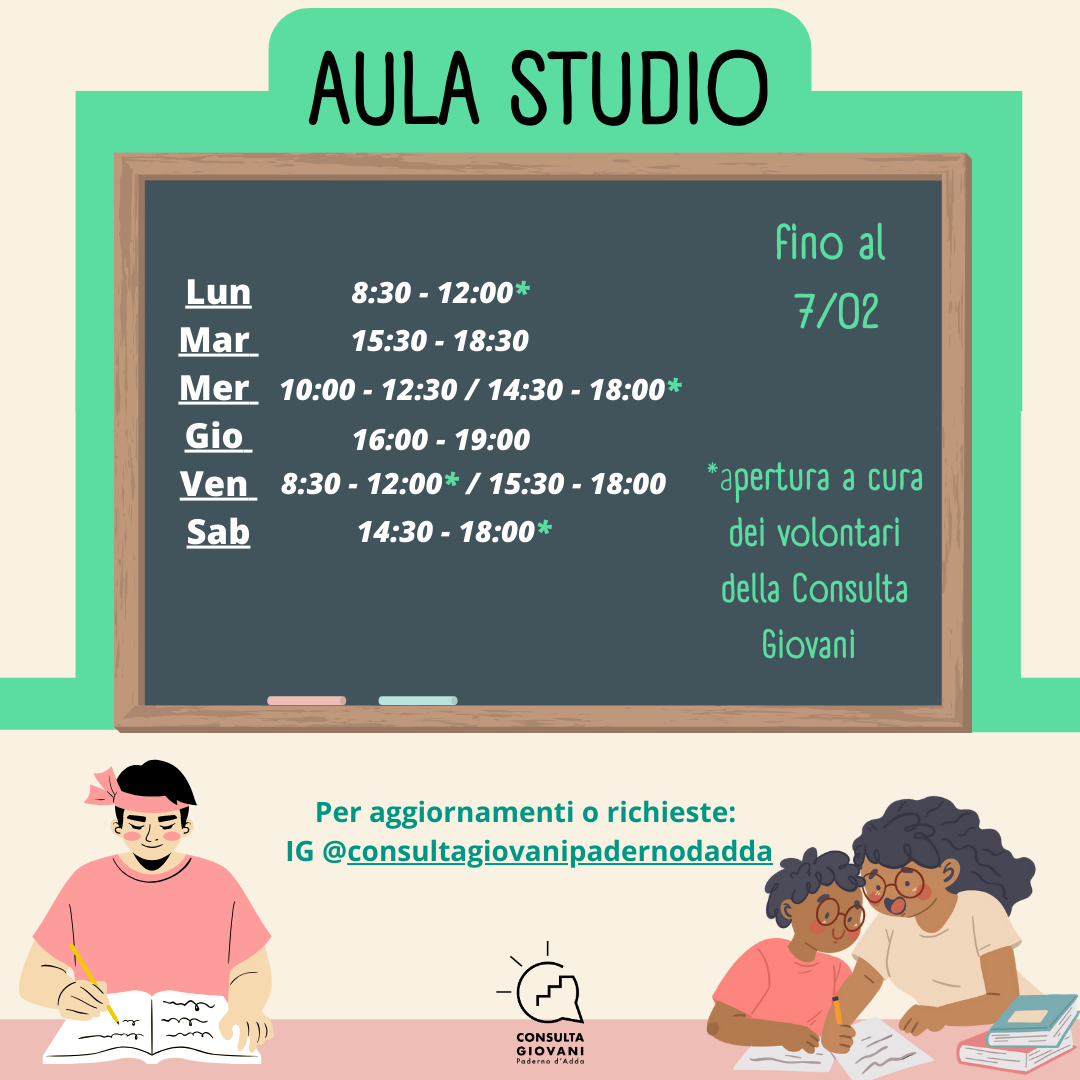 L' Aula Studio Libro Aperto presso la Biblioteca Comunale segue i medesimi orari della Biblioteca, consultabili a questa pagina:
