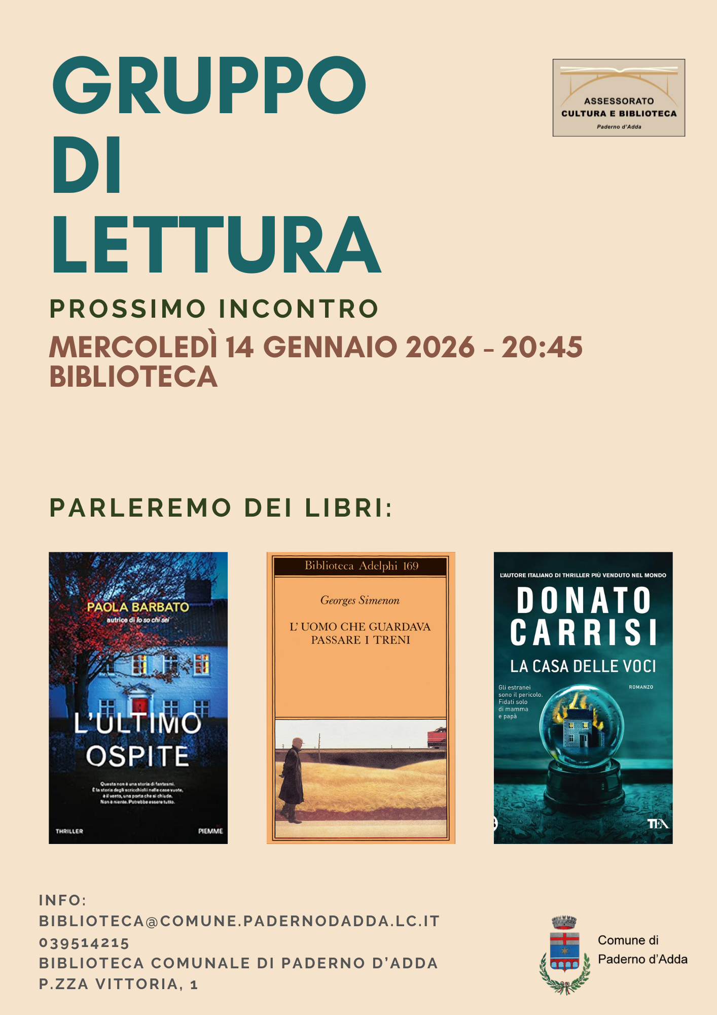 L'Assessorato Cultura e Biblioteca organizza in data mercoledì 14 gennaio 2026 alle ore 20,45 in Biblioteca