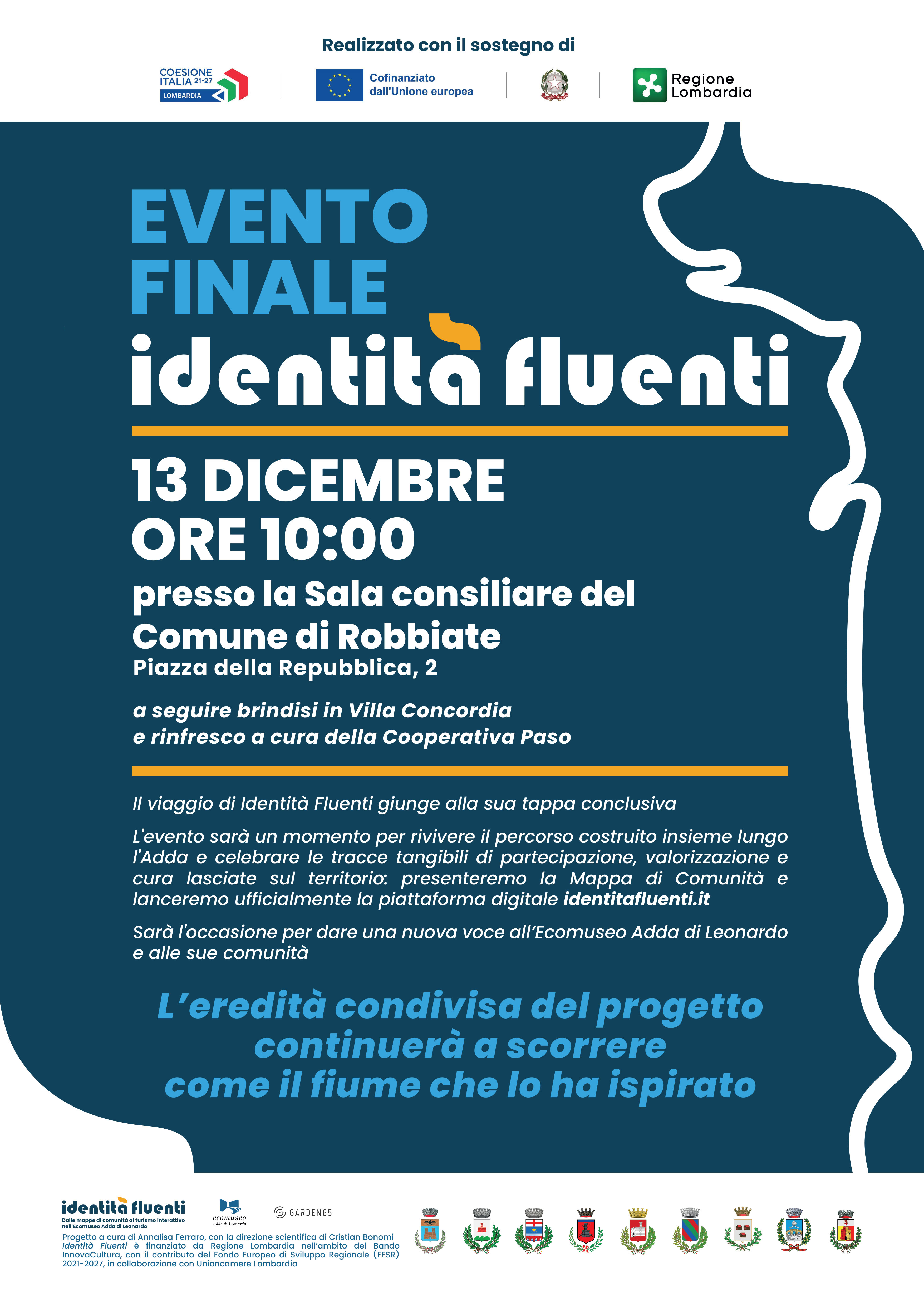 L'evento sarà un momento per rivivere il percorso costruito insieme lungo l'Adda e celebrare le tracce tangibili di partecipazione, valorizzazione e cura lasciate sul territorio con la presentazione della Mappa di Comunità e il lancio della piattaforma digitale: identitafluenti.it
