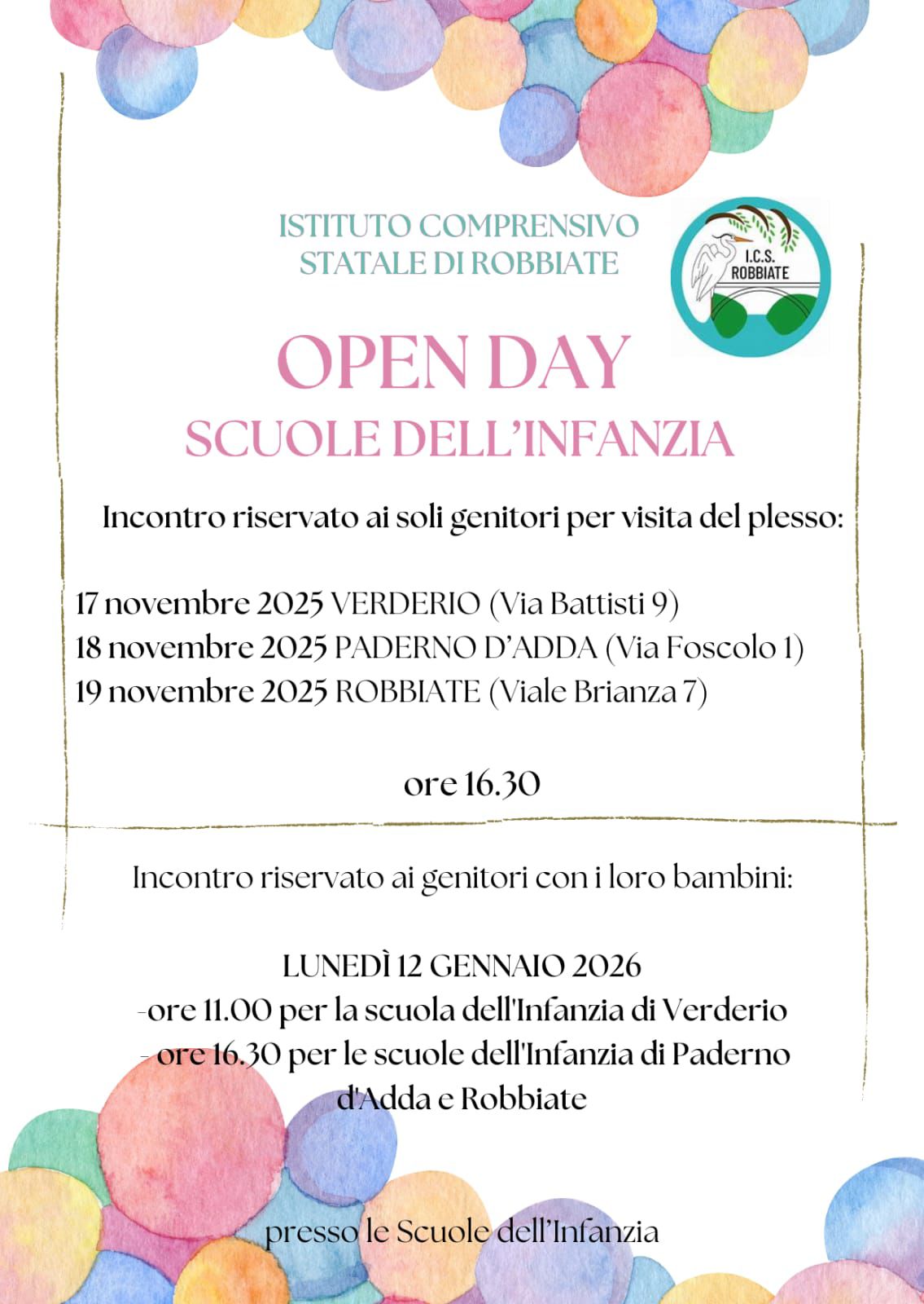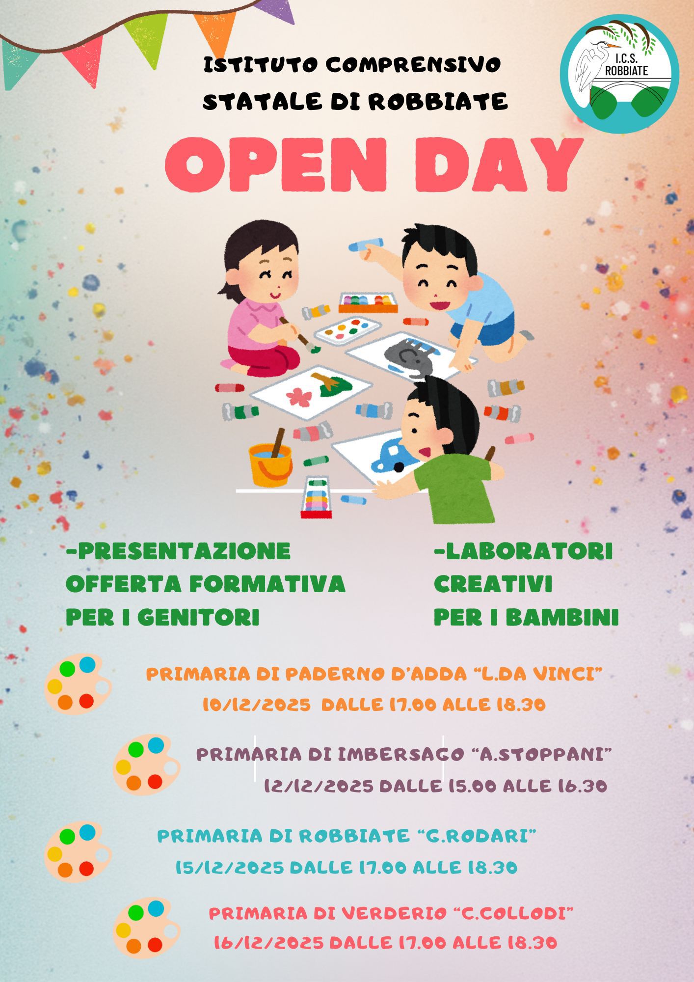 In allegato Locandine con indicazione delle date degli Open Day delle Scuole dell'infanzia e delle Scuole Primarie dell'Istituto Comprensivo di Robbiate.