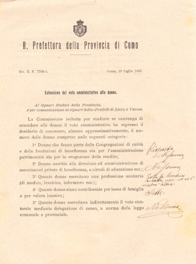 Documenti relativi a una possibile estensione del diritto di voto amministrativo alle donne, 1907