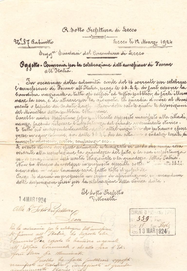 Documenti relativi all’annessione della città di Fiume all’Italia, 1924