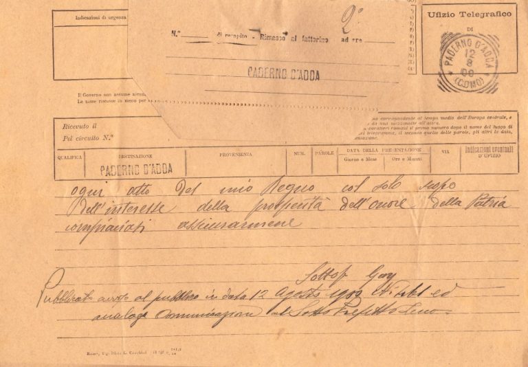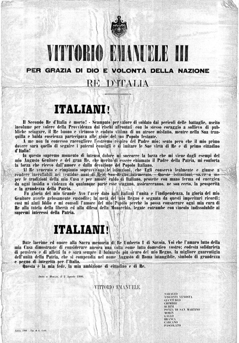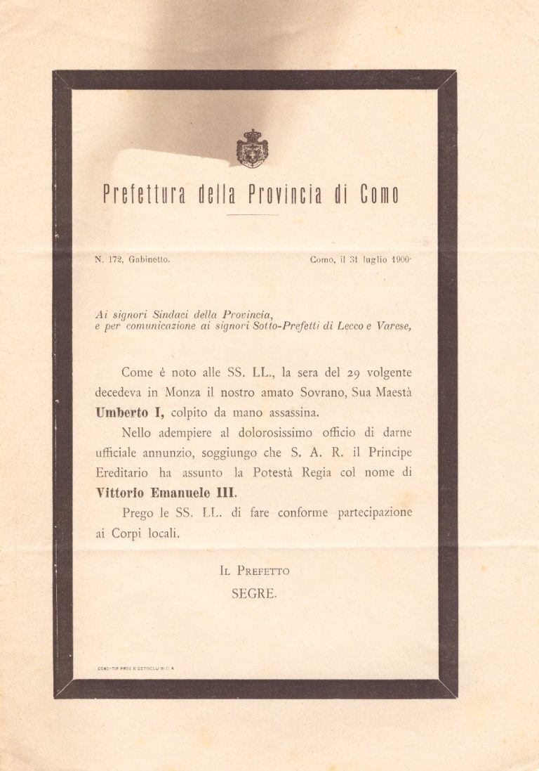 Documenti relativi all’assassinio del “Re Buono” Umberto I, Monza, 1900