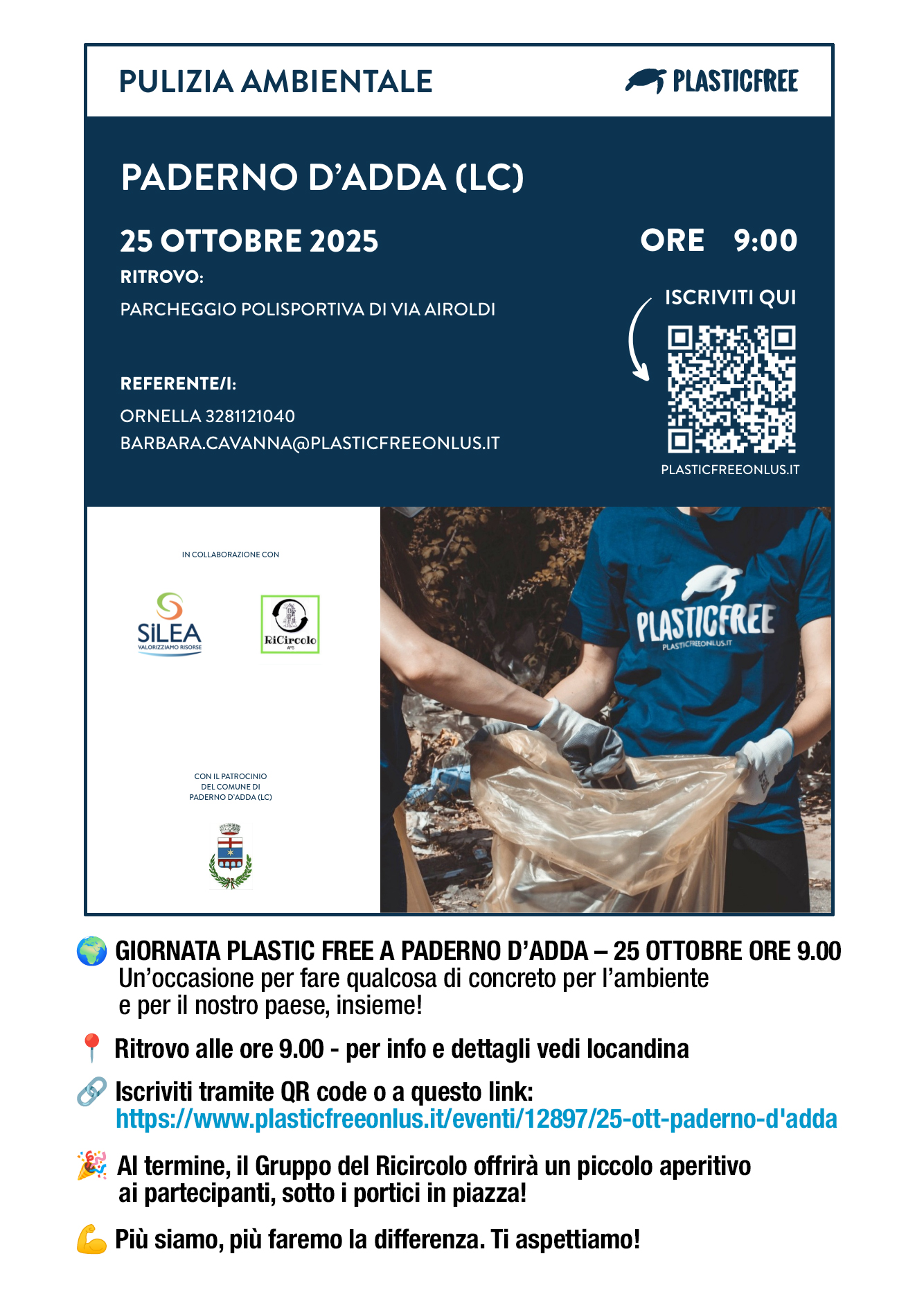 Il 25 ottobre 2025 il Comune di Paderno d'Adda in collaborazione con RiCircolo e SILEA S.P.A. ha organizzato una giornata Plastic free" dedicata alla pulizia ambientale del territorio: